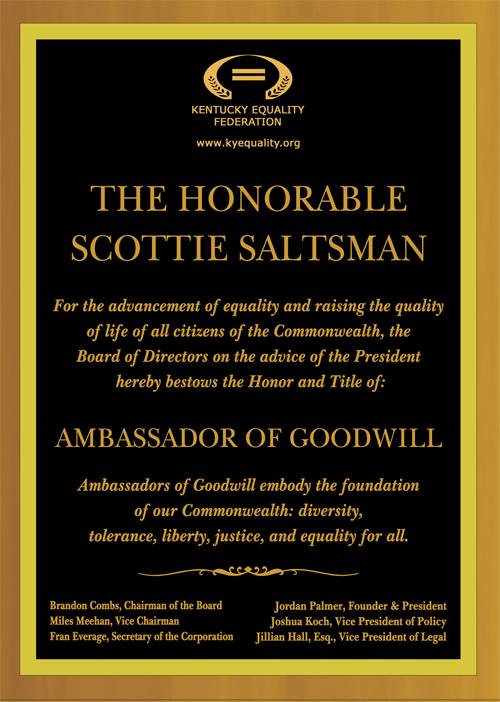 “The distinction of Ambassador of Goodwill was so rare that only 14 people have made it through the approval process,” stated Legal Assistant Lara Clay Drake with Kentucky Equality Federation’s Legal Department. “This is not an honor that is given to different people year after year, nor an annual award given to someone. The candidate must truly be remarkable and have shaped Kentucky culture in a positive manner.”