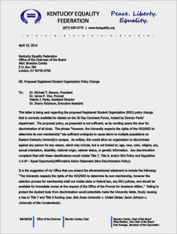Brandon Combs, Chairman of the Board for the Kentucky Equality Federation, reached out to Dr. Michael T. Benson, President, and Dr. Janna P. Vice, Provost, of Eastern Kentucky University regarding a proposed policy change for Registered Student Organizations (RSO). (download)