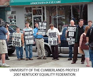 In 2007 Kentucky Equality Federation co-sponsored the 2007 Soulforce/Equality Ride at the University of the Cumberlands. Dozens of gay and lesbian activists were arrested and community members held signs reading “You Will Be Judged,” and “Repent Now,” among others. Nick Herweck, now Kentucky Equality Federation’s Treasurer spent most of the day directing representatives from Soulforce to the Whitley County Jail to post bond for those arrested.
