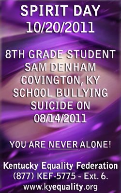 “The suicide of Covington 8th Grade Student Sam Denham on Friday, October 14, 2011 is proof that educators need additional training on how to handle school bullying, and that students who are bullied know they are not alone. It is also proof of failure of the Kentucky Senate, who has in the past killed legislation to expand school bullying laws in Kentucky. However, Kentucky Equality Federation’s Discrimination, Hate Crimes, and School Bullying Committee stand ready to assist anyone who suffers from school bullying. Our children need to be taught tolerance, and the wonderful diversity of people Kentucky has. Across the Commonwealth schools have gay, lesbian, bisexual, transgender, intersex, Black, Jewish, Asian, and Middle Eastern students just to name a few. Our children need to be taught about these different cultures and the different types of families across Kentucky. We are talking about basic education to live and let live, diversity, tolerance, and finally the acceptance of others.”